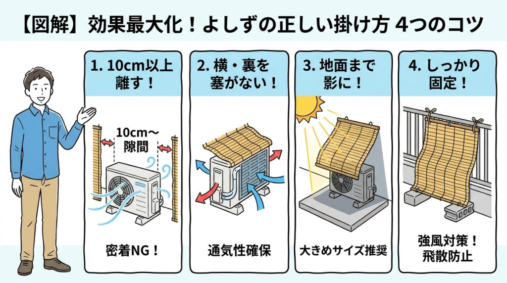- 掛け方のコツ:室外機から離す、空気の通り道を塞がない、最適な角度と大きさ、しっかり固定する。